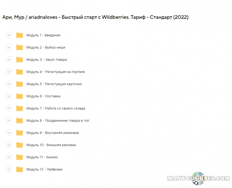 Вы находитесь на странице товара «Ари, Мур / ariadnaloves - Быстрый старт с Wildberries. Тариф - Стандарт», это материал 2022 года, который, мы надеемся, принесет вам пользу. Все курсы доступны по очень низкой цене, в отличии от оригинальной цены автора в размере рублей. Вы же получаете этот курс, купив в нашем магазине Coursx.net, с огромной скидкой, всего 630 рублей. На каждый курс Вы можете посмотреть оригинальный продажник, после чего принять решение о покупке. Обучающий курс входит в рубрику «Бизнес, менеджмент, продажи / Wildberries», спросом которой пользуется множество покупателей. В нашем магазине Вы найдёте ещё много курсов от автора «Ари, Мур», достаточно ввести в поиск имя автора.