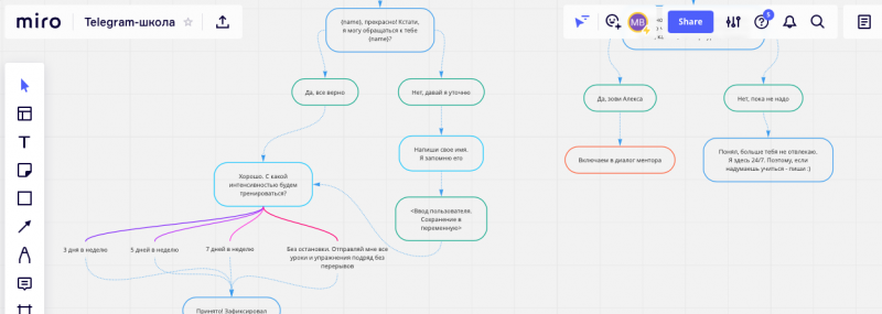 В данных сценариях мы описываем то, как бот должен и будет себя вести с потенциальными покупателями наших образовательных продуктов и теми, кто уже учится в нашей школе. Так, в отношении первых, бот постепенно прогревает потенциального слушателя, технично доводит его до совершения покупки. А далее, полностью управляет образовательным процессом.