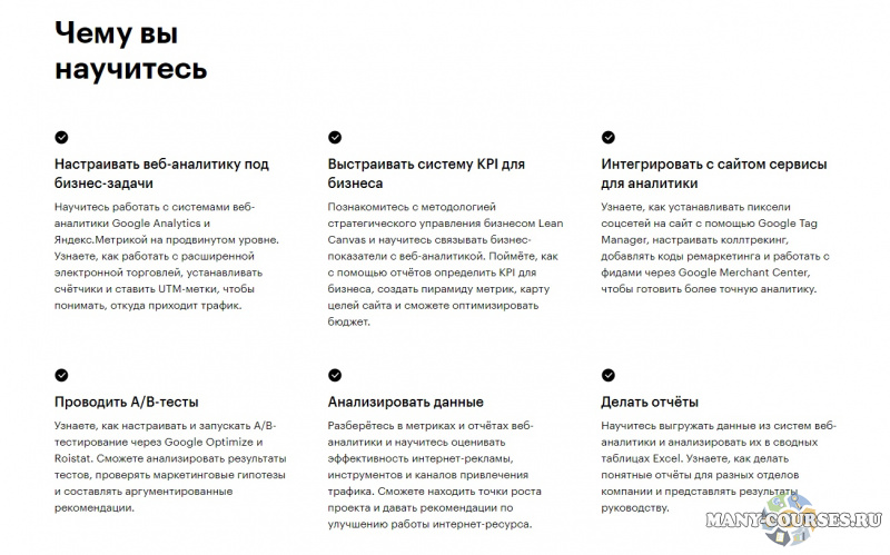 Разберётесь в метриках и отчётах веб-аналитики и научитесь оценивать эффективность интернет-рекламы, инструментов и каналов привлечения трафика. Сможете находить точки роста проекта и давать рекомендации по улучшению работы интернет-ресурса.