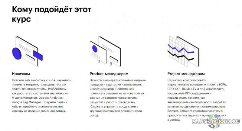 Вы научитесь работать с основными системами веб-аналитики, собирать данные и понимать ключевые метрики. Узнаете, как анализировать поведение пользователей, эффективность сайта и трафика и повышать отдачу от рекламы. Сможете начать карьеру в веб-аналитике или прокачать навыки работы с продуктом.