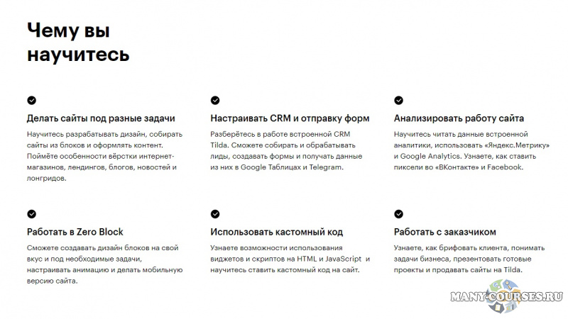 Вы научитесь создавать сайты на конструкторе Tilda и поймёте, как презентовать проекты. Сможете запустить сайт для себя или предложить свои услуги рынку.
