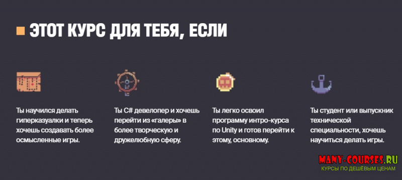 ЦЕЛЬ КУРСА - Научить тебя работать в Unity и самостоятельно создавать игры. Пройдя курс, ты сможешь реализовывать свои идеи для игр без посторонней помощи. Курс полностью построен вокруг проекта: все знания ты сразу применяешь на практике и сможешь использовать в своих следующих играх.