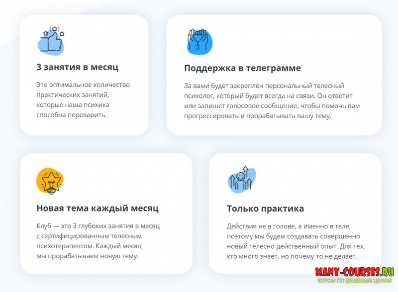 Клуб — это 3 глубоких занятия в месяц с сертифицированным телесным психотерапевтом. Каждый месяц мы прорабатываем новую тему.