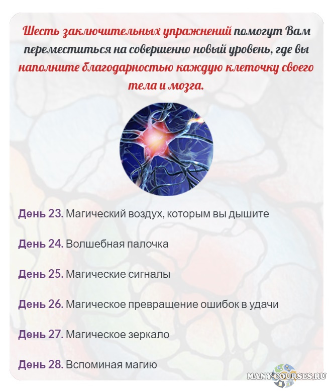 Шесть заключительных упражнений помогут Вам переместиться на совершенно новый уровень, где вы наполните благодарностью каждую клеточку своего тела и мозга.