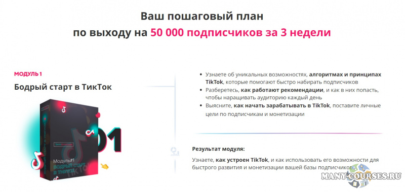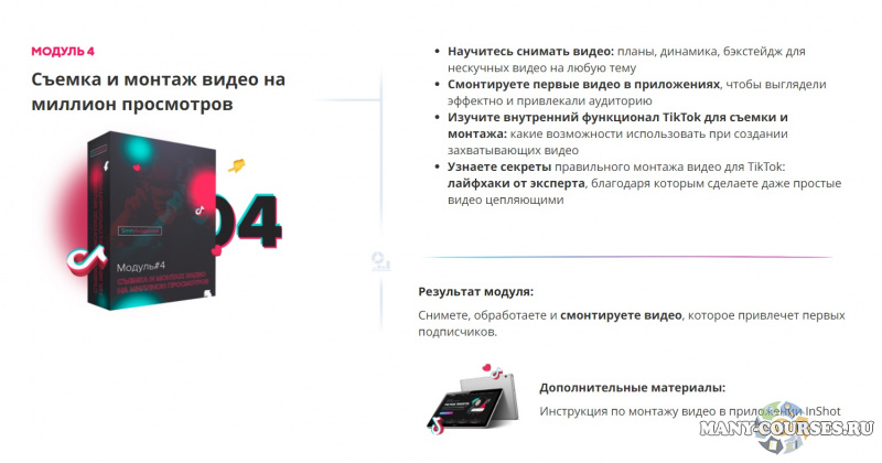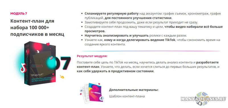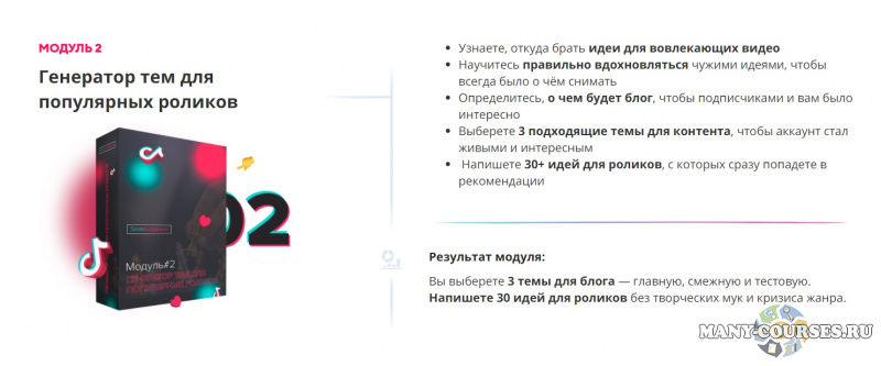 Результат модуля - Узнаете, как устроен TikTok, и как использовать его возможности для быстрого развития и монетизации вашей базы подписчиков.
