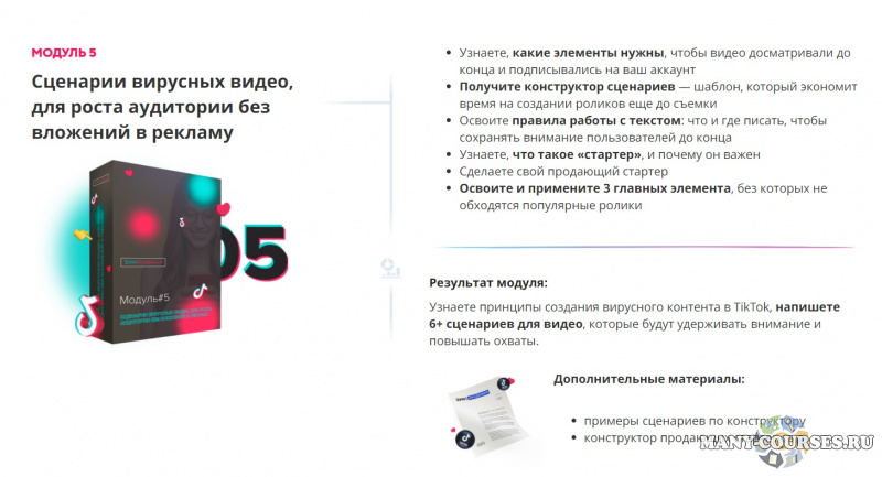 Результат модуля - Узнаете принципы создания вирусного контента в TikTok, напишете 6+ сценариев для видео, которые будут удерживать внимание и повышать охваты.