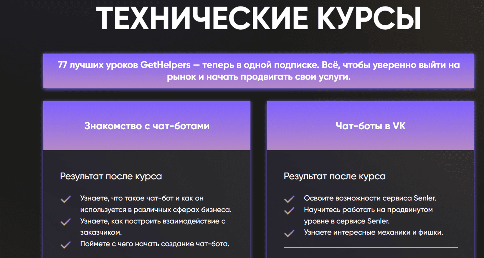 77 лучших уроков GetHelpers — теперь в одной подписке. Всё, чтобы уверенно выйти на рынок и начать продвигать свои услуги.