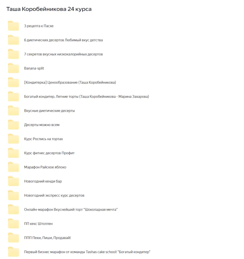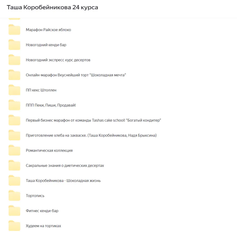 Лиана Мидави - Рацион питания без глютена, сахара и лактозыИльназ Искаков - Веганские тарты без пшеничной муки и сахарного пескаButter School / Алёна Ерёмина - Осенний гид: сезонные заготовки и рецепты для лёгкой и красивой кухниTasha’s cake school / Таша Коробейникова ― Дубайские десерты (2025)Fashion Factory School / Екатерина Дягилева - Ассортиментная матрица и производство коллекции. Март 2024