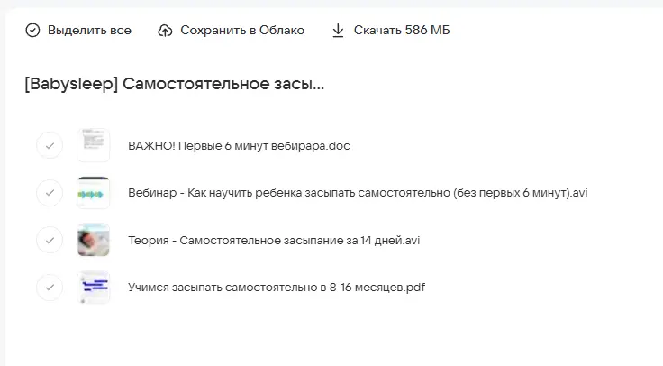 Babysleep - Самостоятельное засыпание за 14 дней 2 модуль. 5,5 мес.–3 годаАндрей Тарасевич - Восстановление сна за 14 днейТатьяна Холодкова - Азбука сна. Тариф «Платина»Schoolmom / Валентина Игнатенко - Секреты декрета. Лучшее! Тариф Мама-ниндзя 1Ева Азарова - SuperMama 3.0. 8 курсов для мам с детьми от 0 до 1 года. Тариф 3 месяца