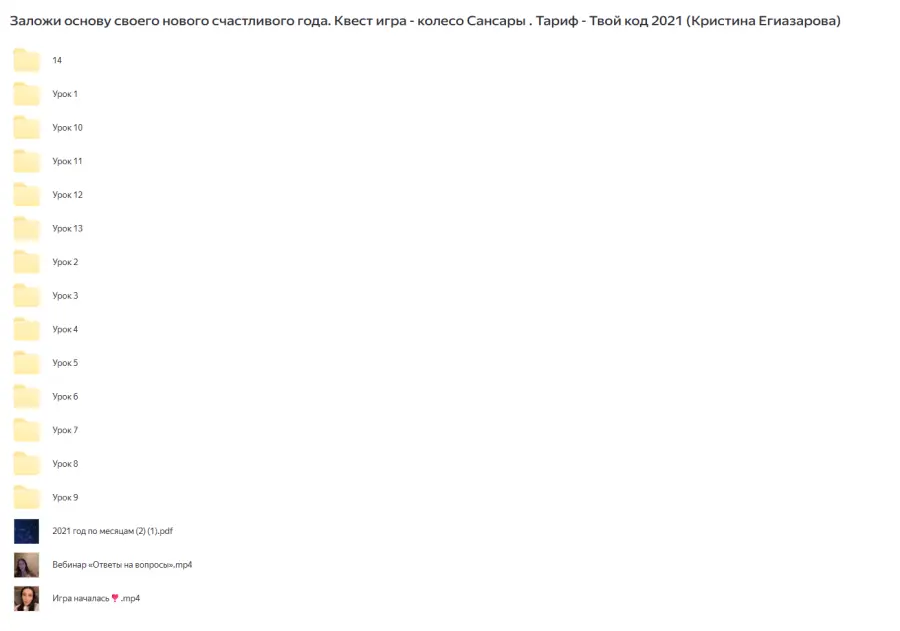 Вы находитесь на странице товара «Кристина Егиазарова - Заложи основу своего нового счастливого года. Квест игра колесо Сансары. Тариф Твой код 2021», это материал 2021 года, который, мы надеемся, принесет вам пользу. Все курсы доступны по очень низкой цене, в отличии от оригинальной цены автора в размере рублей. Вы же получаете этот курс, купив в нашем магазине Coursx.net, с огромной скидкой, всего 330 рублей. На каждый курс Вы можете посмотреть оригинальный продажник, после чего принять решение о покупке. Обучающий курс входит в рубрику «Эзотерика и оккультизм», спросом которой пользуется множество покупателей. В нашем магазине Вы найдёте ещё много курсов от автора «Кристина Егиазарова», достаточно ввести в поиск имя автора.