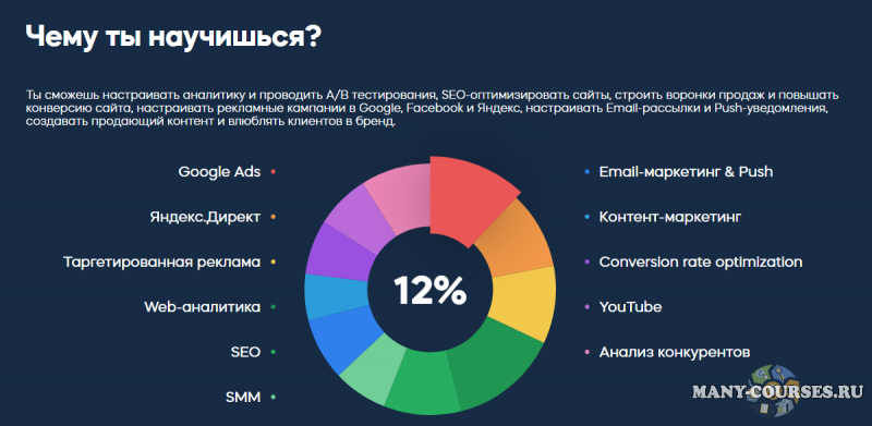 Программа состоит из теоретических лекций, которые помогут понять принципы работы каждого инструмента, и практических воркшопов, на которых вы научитесь самостоятельно работать с каждым инструментом интернет-маркетинга.