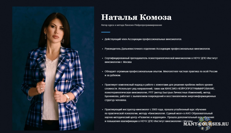 Практикующий инструктор-кинезиолог с 2003 года, прошла углубленный курс обучения по практической психологии, методу «Кинезиология. Единый мозг» в АНО Образовательный научно-методический центр «Развитие и коррекция». Прошла дополнительный курс обучения и повышения квалификации в НОЧУ ДПО Институт кинезиологии г. Москвы.