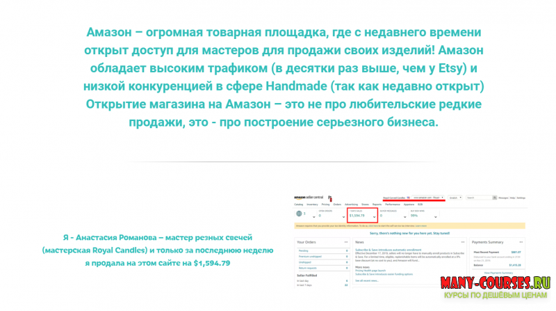 Вы находитесь на странице товара «Анастасия Романова - Amazon Handamde. Тариф «Наполнение» (2021)», это материал 2021 года, который, мы надеемся, принесет вам пользу. Все курсы доступны по очень низкой цене, в отличии от оригинальной цены автора в размере 17000 рублей. Вы же получаете этот курс, купив в нашем магазине Coursx.net, с огромной скидкой, всего 99 рублей. На каждый курс Вы можете посмотреть оригинальный продажник, после чего принять решение о покупке. Обучающий курс входит в рубрику «SEO и SMM», спросом которой пользуется множество покупателей. В нашем магазине Вы найдёте ещё много курсов от автора «Анастасия Романова», достаточно ввести в поиск имя автора.